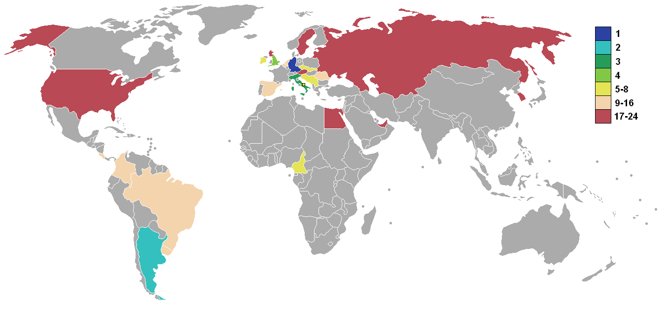En cursiva, los debutantes en la Copa Mundial de Fútbol.